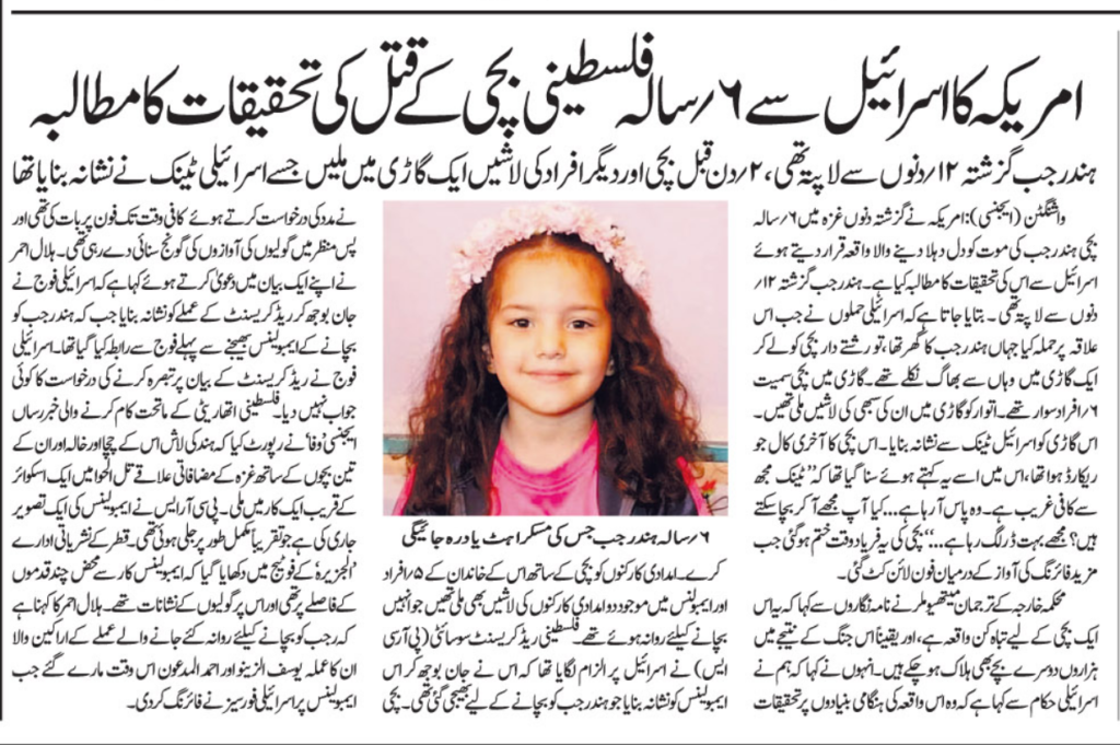 چھ سالہ فلسطینی بچی کا قتل و دیگر خبریں